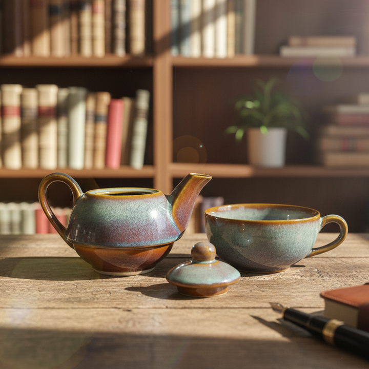 Stone Blue Double-Decker Teapot for One – Ceramic Tea Pot & Cup Set